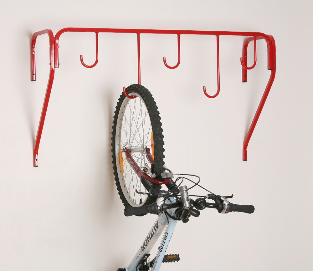 wieszak na rower. Wykonane ze sztywnych profili stalowych. Zabezpieczenie powierzchni odbywa się czerwoną farbą proszkową, jest gotowa do zakotwienia w ścianie. Gdy nie jest używany, wieszak można złożyć na ścianie, aby zaoszczędzić miejsce. Złożony wieszak ma szerokość zaledwie 122 mm. Wymiary po złożeniu (wys. x szer. x gł.): 520 x 530 x 530 mm.