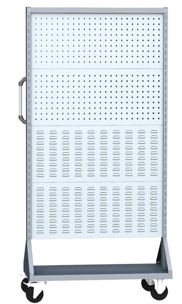 Ruchomy dwustronny stojak na dziurkacz na 6 paneli. Służy do zawieszania narzędzi i pudełek plastikowych. Wymiary całkowite stojaka w mm (wys. x szer. x gł.) 1657 x 1055 x 504.