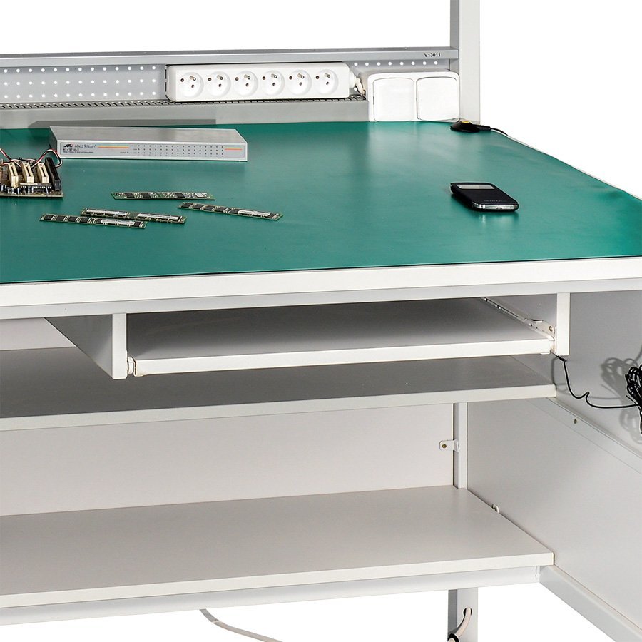 Stół warsztatowy ESD przeznaczony jest do wyposażenia warsztatów, operacji i nowoczesnych laboratoriów w branży mikroelektroniki, gdzie konieczne jest zapobieganie powstawaniu wyładowań elektrostatycznych (ESD – wyładowania elektrostatyczne). Stół spawany z profili stalowych, wysokość 940 x szerokość 1600 x głębokość 810 mm. Kolor gumy jest zielony, niebieski lub szary.