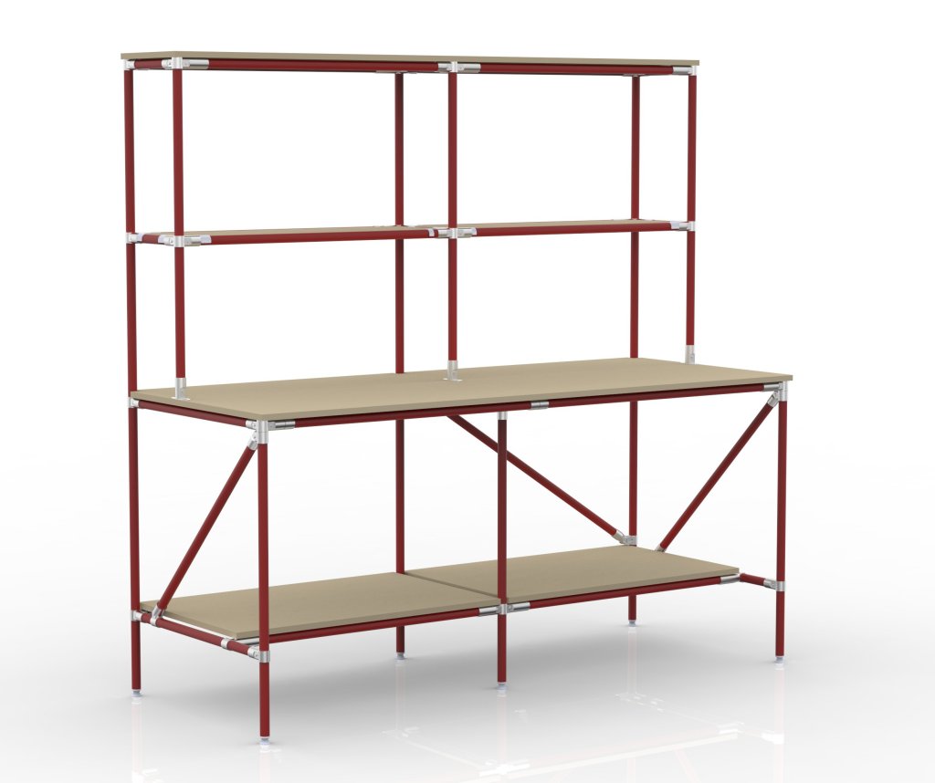 Trwały i ergonomiczny stół warsztatowy do pakowania z rurowego systemu modułowego. Blat i półki wykonane są z płyty wiórowej o grubości 18 mm. Duża powierzchnia blatu i półek. Wymiary konstrukcyjne 1970 x 2000 x 800 mm. Nośność całkowita 350 kg, a nośność pojedynczej półki do 100 kg.