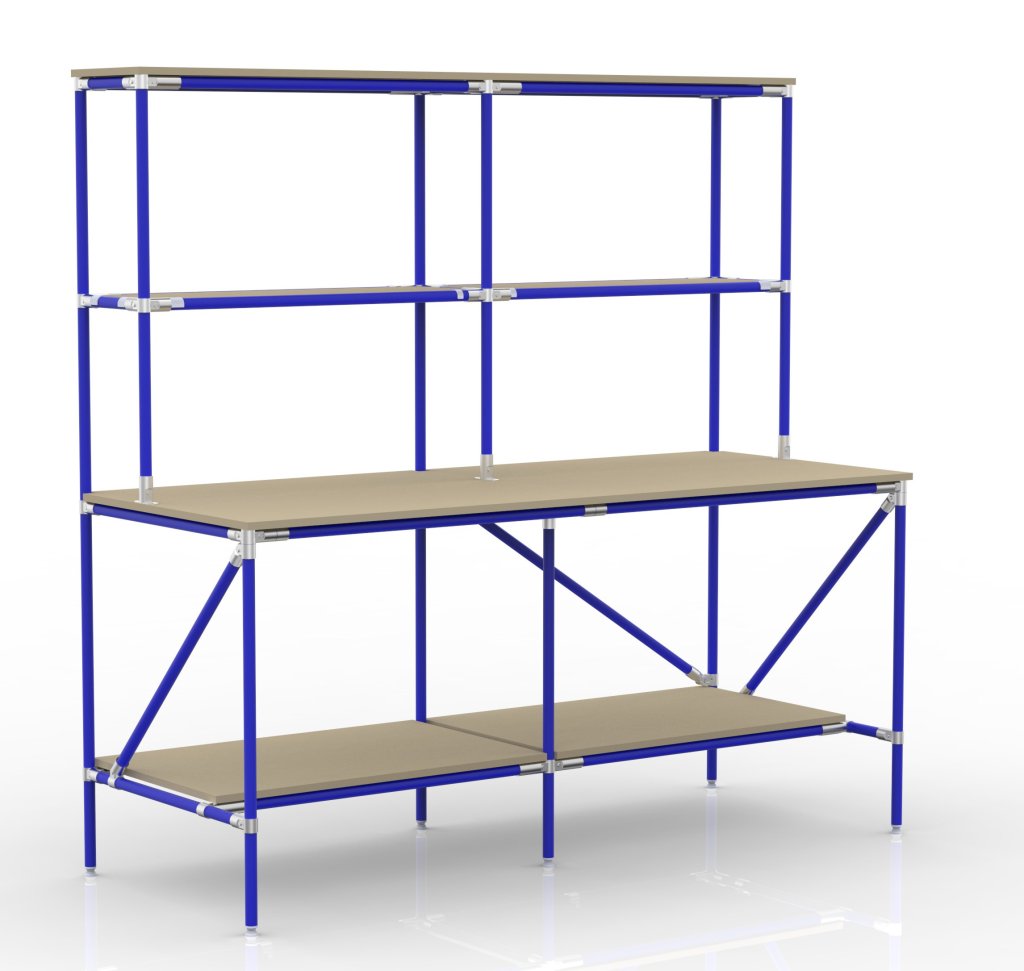 Uniwersalny stół warsztatowy do pakowania przesyłek. Kolor konstrukcji można dobrać odpowiednio do rur. Przy równym obciążeniu nośność wynosi 100 kg. Wymiary 2002 x 1803 x 803 mm. Stół nadaje się do sklepów internetowych, centrów logistycznych i magazynów.