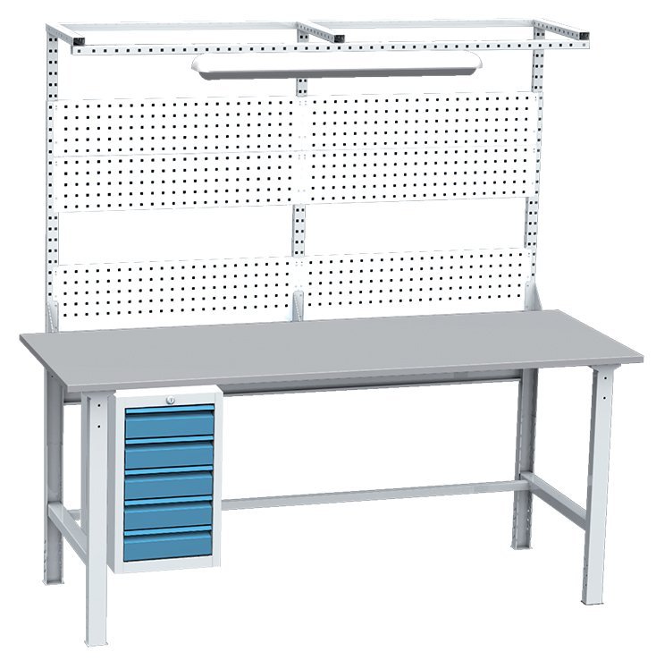 Stół montażowy warszatowy montaż MTS 201, szerokość 2000, wysokość stołu regulowana 1900 - 2180, głębokość 750 mm. Stół zawiera tylny panel perforowany, rampę, podwieszany pojemnik oraz dwuświetlówkę.