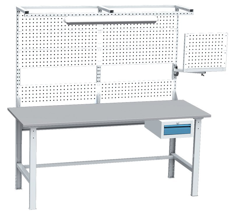 Stół warsztatowy montażowy, montaż MTS 202, szerokość 2800, wysokość stołu regulowana 1900 - 2180, głębokość 750 mm. Stół zawiera tylną tablicę perforowaną, rampę, 1x półkę, 1x półkę boczną, 1x boczną tablicę perforowaną, podnóżek, pojemnik do zawieszania i dwuświetlówkę.