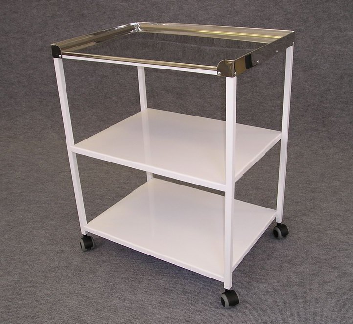 Przenośny stół narzędziowy typ 47621. Stół narzędziowy z płytą ze stali nierdzewnej składa się z metalowej konstrukcji, której powierzchnia została obrobiona technologią proszkową. Górna płyta wykonana jest ze stali nierdzewnej, a dolne płyty magazynujące wykonane są z blachy stalowej..