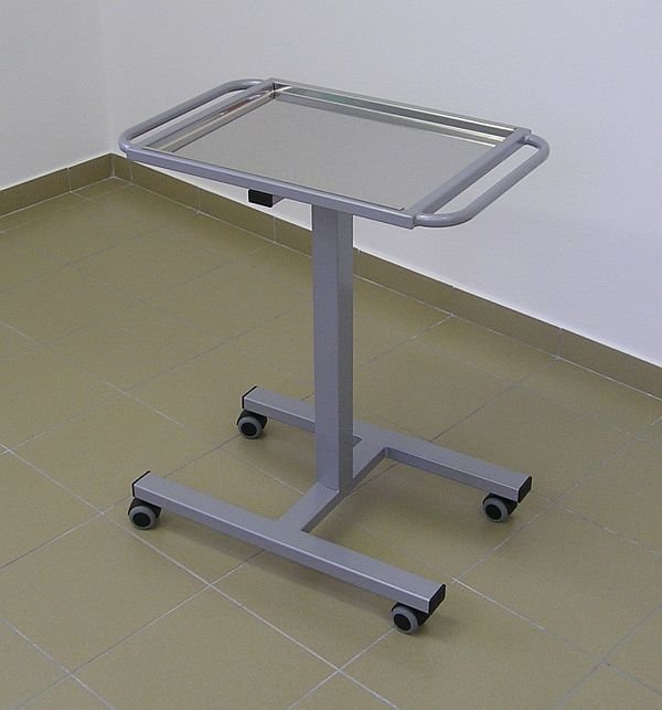 Stół narzędziowy do transportu, konstrukcja ze stali nierdzewnej, wysokość 910 x szerokość 700 x głębokość 480 mm. W razie potrzeby stół można wyposażyć w kółka antystatyczne.