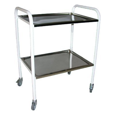 Przenośny stolik boczny lakierowany, powierzchnie do przechowywania ze stali nierdzewnej, jedna szuflada. Dwa kółka z hamulcem i dwa bez hamulca, odpowiednie do przechowywania i transportu narzędzi chirurgicznych i materiałów medycznych. Wysokość 850 x szerokość 640 x głębokość 480 mm. Kolor konstrukcji jest biały.