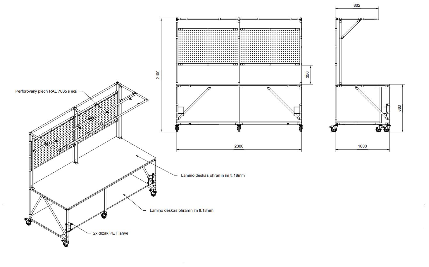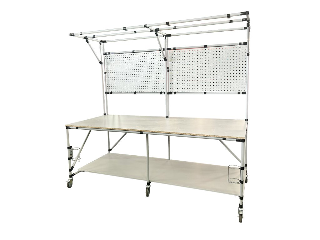 Stół warsztatowy na kółkach to praktyczne rozwiązanie dla mobilnego miejsca pracy. Konstrukcja stołu składa się z tablicy perforowanej w kolorze RAL 7035, płyty laminowanej o grubości 18 mm oraz 2x praktycznych uchwytów na butelki PET. Stół zapewnia wystarczająco dużo miejsca i komfortu do wydajnej pracy w warsztacie. Wysokość powierzchni roboczej 800 mm. Całkowity udźwig 200 kg, nośność na podłogę 100 kg. Wymiary stołu 2100 x 2300 x 1000 mm.