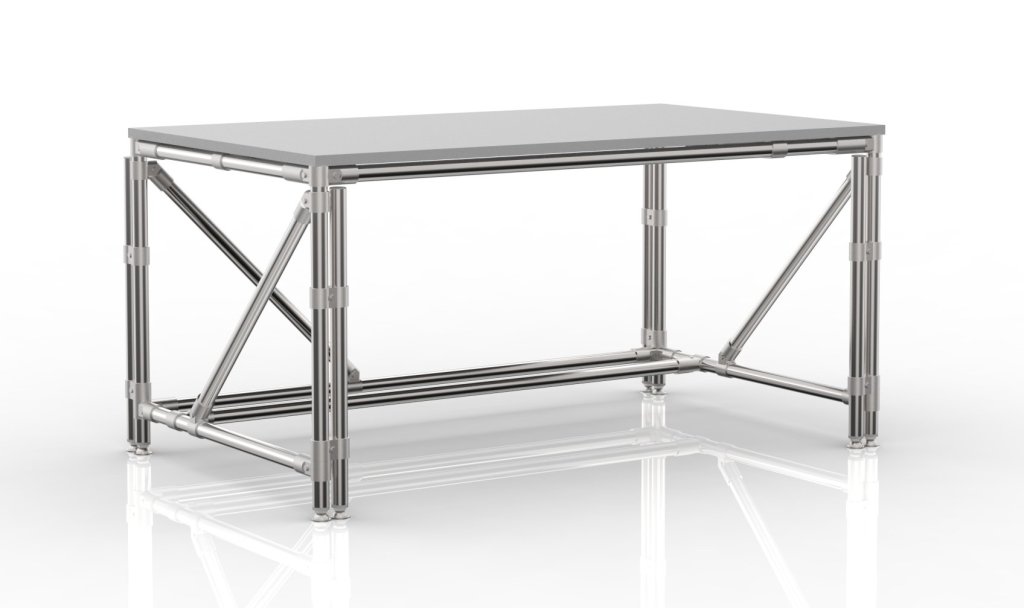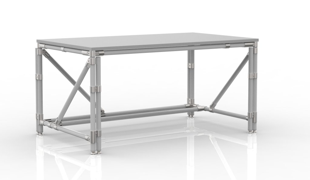 Stół warsztatowy z systemu modułowego rurowego z blatem z laminatu o grubości 18 mm i czterema regulowanymi nogami. Nośność przy równomiernym obciążeniu 100 kg. Wymiary 850 x 2000 x 750 mm.