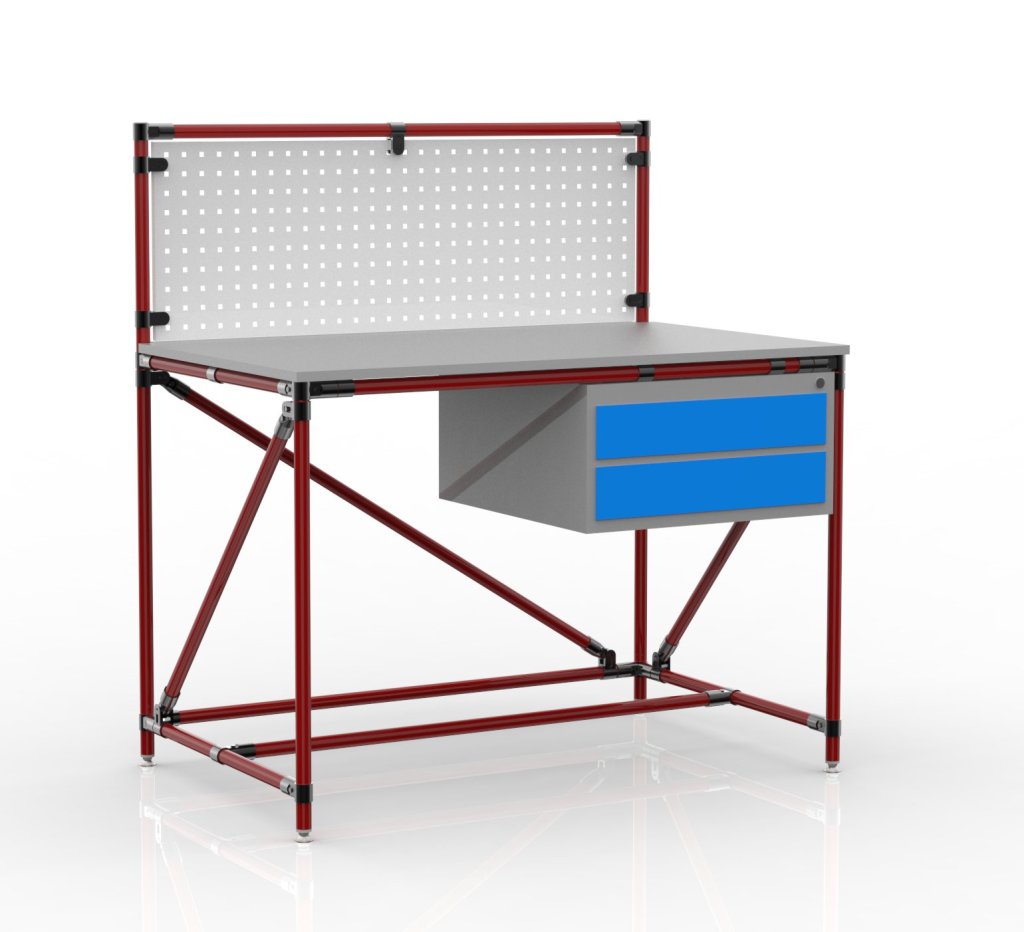 Stół warsztatowy z tablicą perforowaną z systemu modułowego rurowego. W skład stołu wchodzi blat laminowany, kontenerek podwieszany z 2 szufladami, tablica narzędziowa oraz cztery regulowane nogi. Nośność przy równomiernym obciążeniu 100 kg. Wymiary 1282 x 1200 x 750 mm.