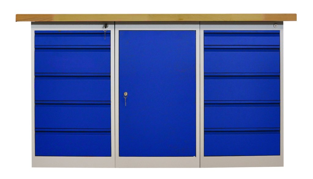 Stół warsztatowy z blatem roboczym 40 mm wodoodpornym bukowym. 3x kontenerek stojący, wysokość 810, szerokość 461, głębokość 600 mm. Stół ma nośność 500 kg, wysokość 850, szerokość 1500, głębokość 750 mm, kolor pojemnika szary RAL 7035/niebieski RAL 5010. Drzwi można umieścić z obu stron. Półki można zdejmować, ale nie można ich regulować.