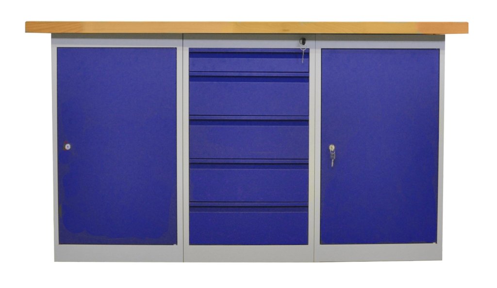 Stół warsztatowy z blatem roboczym 40 mm wodoodpornym bukowym. 3x kontener stojący, wysokość 810, szerokość 461, głębokość 600 mm. Stół ma nośność 500 kg, wysokość 850, szerokość 1500, głębokość 750 mm, kolor pojemnika szary RAL 7035/niebieski RAL 5010. Drzwi można umieścić z obu stron. Półki można zdejmować, ale nie można ich regulować.