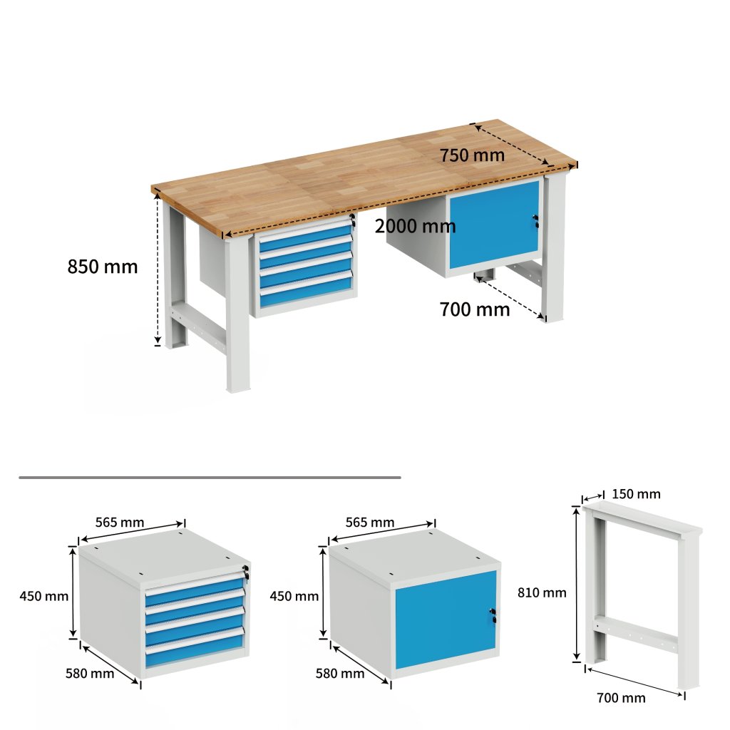 Stół z blatem roboczym 40 mm wodoodpornym bukowym. Wymiary nóg: wysokość 810, szerokość 150, głębokość 699 mm. Kontener podwieszany i kontener podwieszany z czterema szufladami, wysokość 450, szerokość 565, głębokość 580 mm. Stół ma nośność 500 kg, wysokość 850, szerokość 2000, głębokość 750 mm, kolor konstrukcji jasnoszary RAL 7035, kolor szuflad i drzwi RAL 5012.