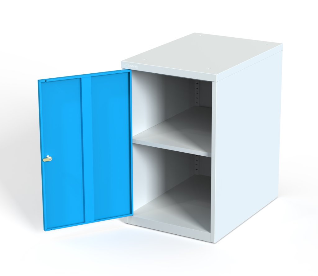 Stół warsztatowy z blatem roboczym 40 mm, jest to płyta wodoodporna bukowa. 1x kontenerek stojący, wysokość 810, szerokość 461, głębokość 600 mm, 1x noga. Stół ma nośność 500 kg, wysokość 850, szerokość 1500, głębokość 750 mm, kolor pojemnika szary RAL 7035/niebieski RAL 5010. Drzwi można umieścić z obu stron. Półki można zdejmować, ale nie można ich regulować.