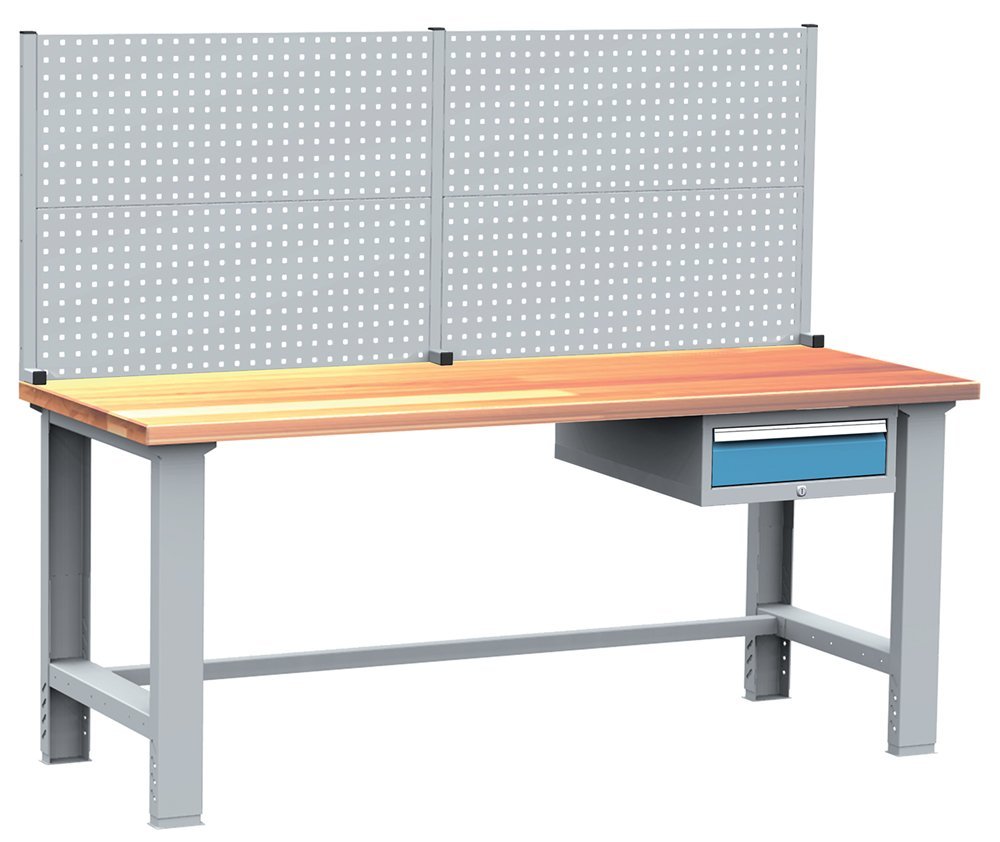 Stół warsztatowy DPS 205, szerokość 2000, wysokość 850, głębokość 750 mm. Nośność półki 60 kg, nośność szuflady 80 kg. Na stanie jasnoszary korpus, niebieski pojemnik, niebieskie szuflady, deska bukowa 40 mm.