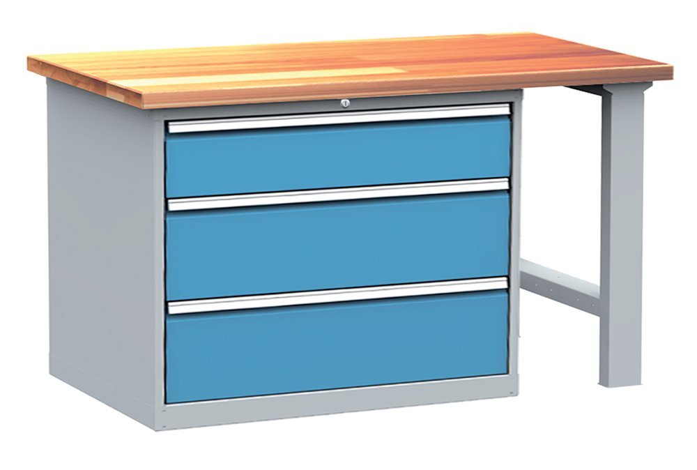 Stół warsztatowy z kontenerkiem, montaż DPS 102, szerokość 1500, wysokość 850, głębokość 750 mm. Zestaw składa się z blatu wykonanego z drewna bukowego o grubości 40 mm, stałej metalowej nogi oraz trzyszufladowego pojemnika DPK 01A. Nośność szuflady 80 kg. Na stanie jasnoszary korpus i niebieskie szuflady.