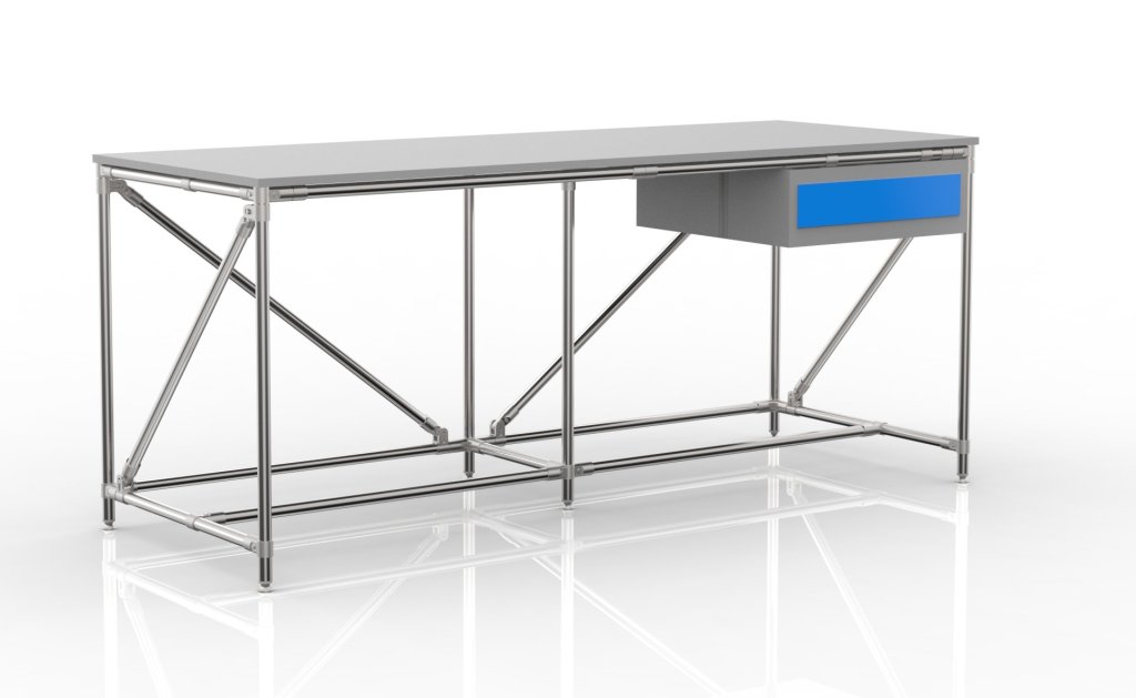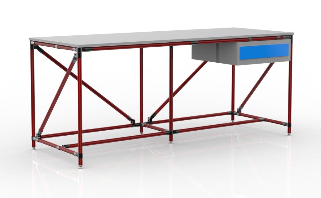 Stół warsztatowy wykonany z rurowego systemu modułowego z blatem DTDL o grubości 18 mm, pojemnikiem stołowym z dwiema szufladami i czterema regulowanymi nogami. Nośność przy równomiernym obciążeniu 100 kg. Wymiary 850 x 2000 x 750 mm.