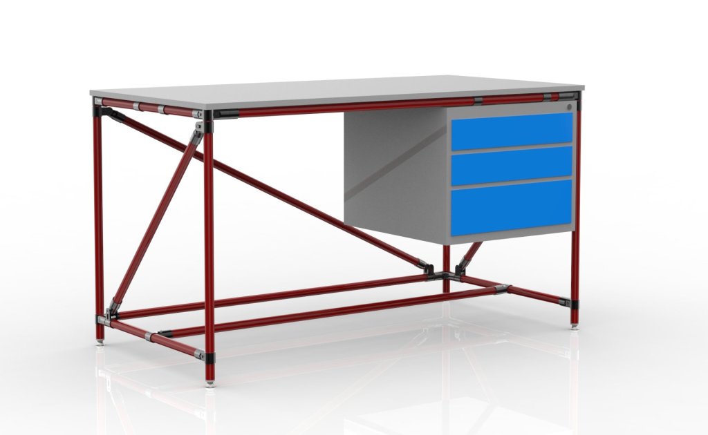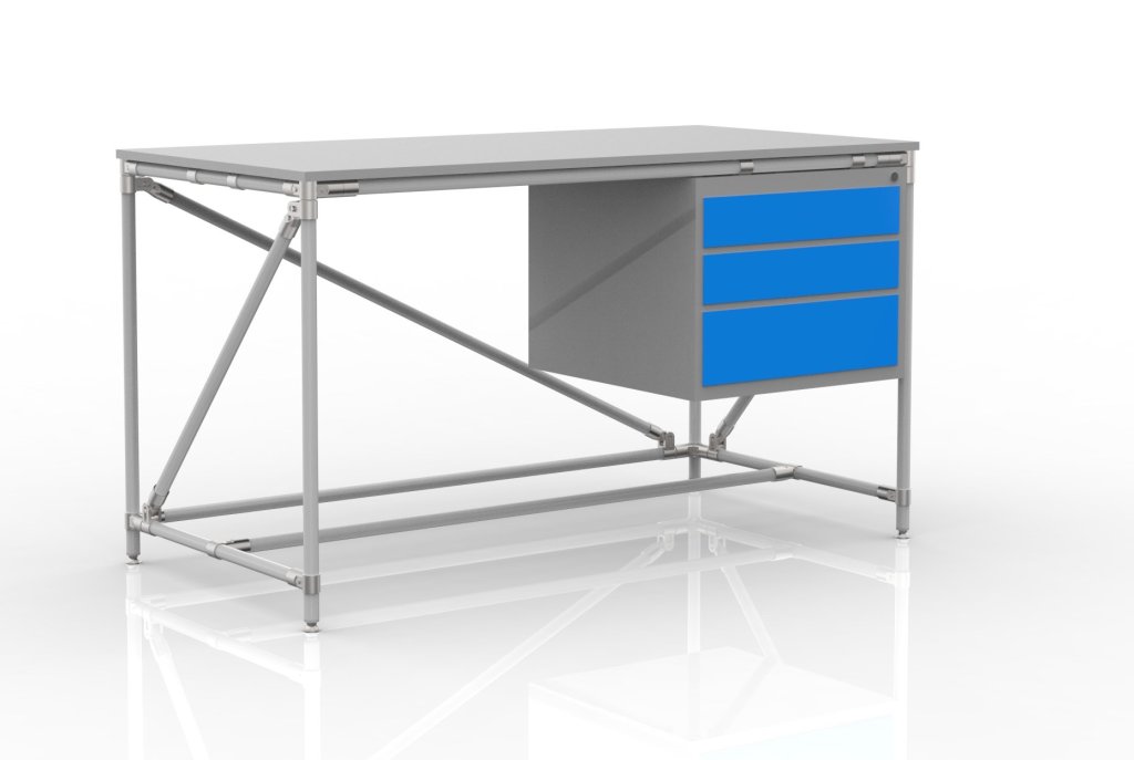 Stół warsztatowy wykonany z systemu modułowego rurowego z blatem z laminatu o grubości 18 mm, kontenerkiem stołowym z trzema szufladami i czterema regulowanymi nogami. Stół zapewnia wystarczającą ilość miejsca do kompletowania, pakowania zamówień itp. Nośność przy równomiernym obciążeniu 100 kg. Wymiary 850 x 1500 x 750 mm.