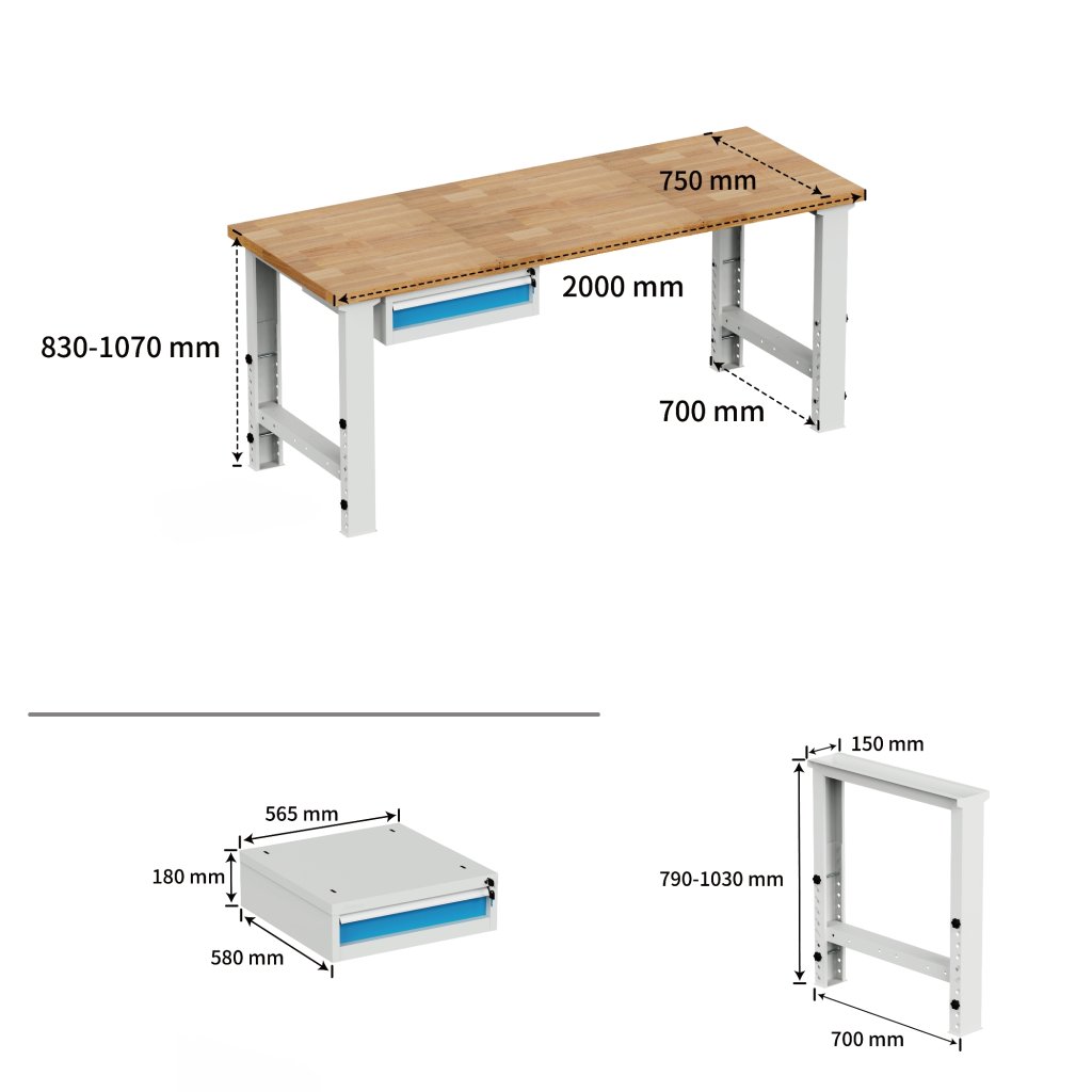 Stół warsztatowy z blatem roboczym 40 mm wodoodpornym bukowym. Wymiary nóg: wysokość 790 - 1030, szerokość 150, głębokość 699 mm. Kontenerek podwieszany z jedną szufladą, wysokość 180, szerokość 565, głębokość 580 mm. Stół ma nośność 500 kg, wysokość 830 - 1070, szerokość 2000, głębokość 750 mm, kolor konstrukcji jasnoszary RAL 7035, kolor szuflady RAL 5012.