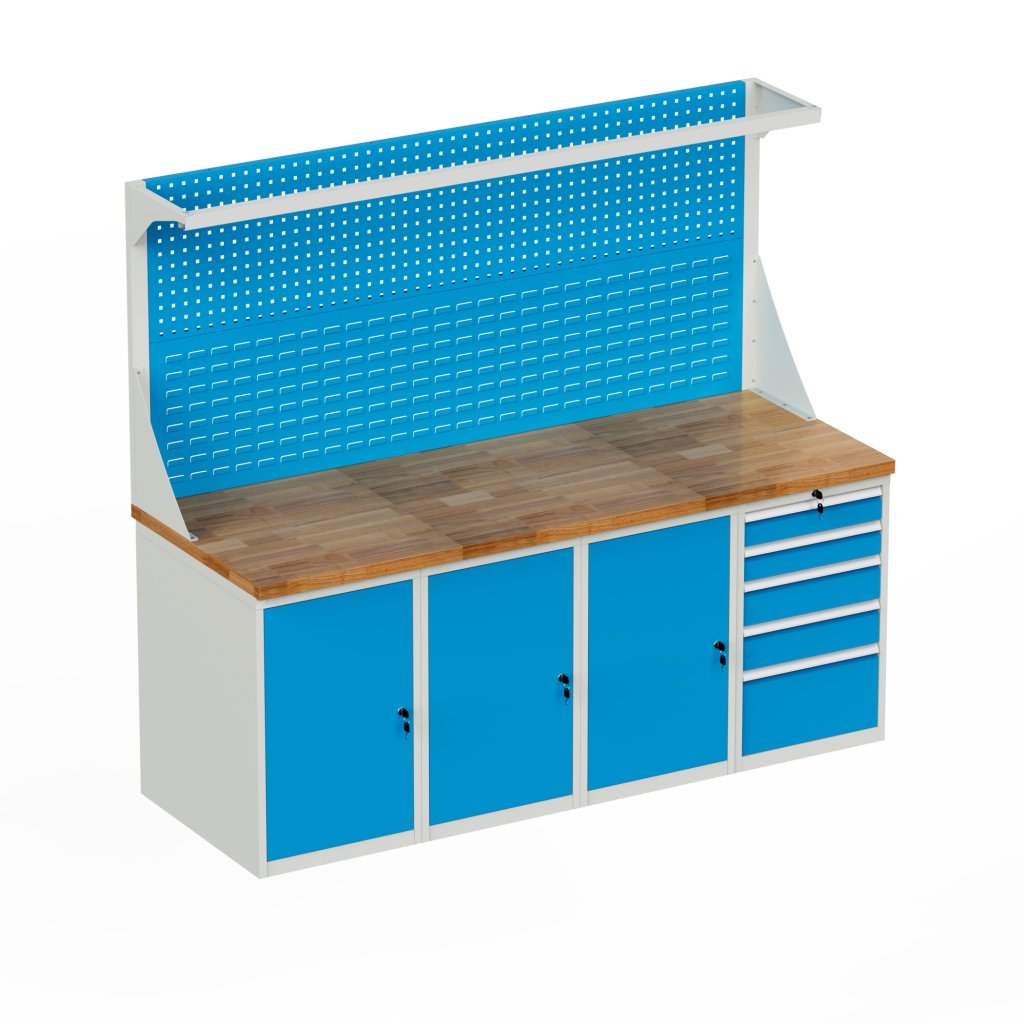 Stół warsztatowy z blatem roboczym 40 mm, jest to płyta wodoodporna bukowa. 1x kontenerek stojący, wysokość 810, szerokość 461, głębokość 600 mm, 1x noga. Stół ma nośność 500 kg, wysokość 850, szerokość 1500, głębokość 750 mm, kolor pojemnika szary RAL 7035/niebieski RAL 5010. Drzwi można umieścić z obu stron. Półki można zdejmować, ale nie można ich regulować.