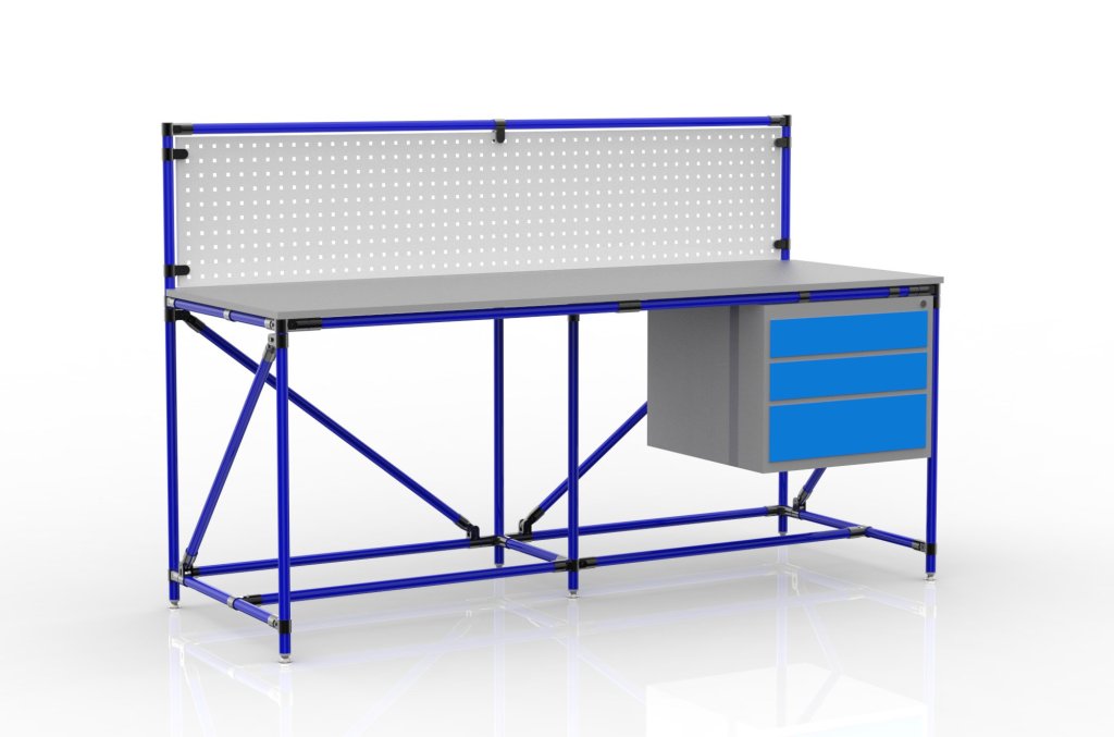 Stół warsztatowy z tablicą perforowaną z systemu modułowego rurowego. Stół składa się z blatu z płyty wiórowej obustronnie laminowanej o grubości 18 mm, kontenerka stołowego z trzema szufladami, tablicy perforowanej do zawieszania narzędzi lub pudełek oraz czterech regulowanych nóżek. Nośność przy równomiernym obciążeniu 100 kg. Wymiary 1282 x 2000 x 750 mm.