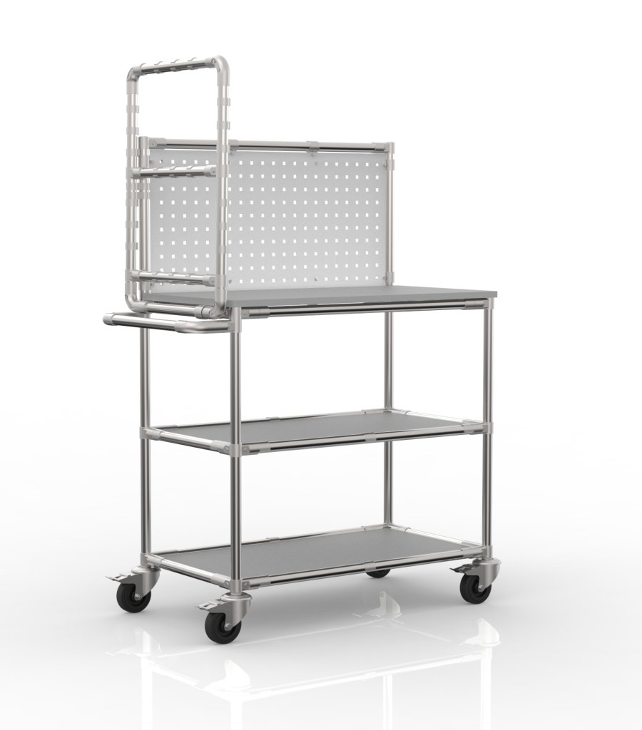 Stół warsztatowy z mechanizmem składania — wykonany z systemu modułowego z rurkami. Stół zawiera składany mechanizm do mocowania worków na śmieci, blat roboczy z laminatu o grubości 18 mm, dwie półki z płytą Akyboard o grubości 10 mm, cztery obrotowe kółka z hamulcem o średnicy 100 mm oraz perforowaną płytę do zawieszania narzędzi lub pojemników. Nośność półki wynosi 50 kg, nośność blatu roboczego wynosi 100 kg, całkowita nośność wynosi 200 kg. Wymiary 1335 x 1029 x 498 mm, wymiary po złożeniu uchwytu 1335 x 1595 x 498 mm.