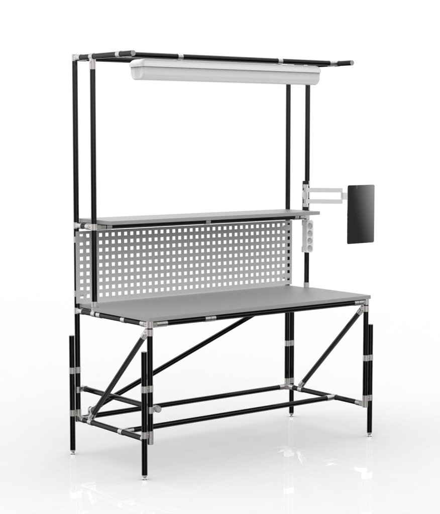 Stół antystatyczny z regulacją wysokości z rurowego systemu modułowego. Stół wyposażony jest w płytę laminowaną ESD o grubości 19 mm, która zapewnia niezawodną ochronę przed ładunkami elektrostatycznymi. W zestawie znajduje się również pojemnik ESD, panel dziurkacza ESD, oświetlenie i aluminiowa płytka z klipsem A4, która pozwala mieć ważne dokumenty pod ręką. Nośność przy równomiernym obciążeniu 150 kg. Stół posiada regulowaną wysokość w zakresie 650 – 950 mm. Wymiary 2100 x 1500 x 700 mm.