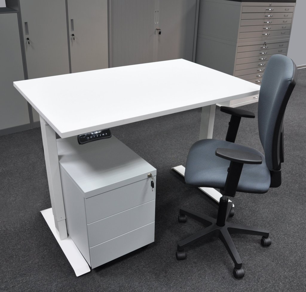 Stół z elektryczną regulacją wysokości z pojemnikiem z trzema szufladami i krzesłem. Udźwig krzesła 120 kg. Zakres regulacji wysokości blatu roboczego 735 – 1235 mm. Głębokość blatu 800 mm. Stół umożliwia pracę zarówno w pozycji stojącej, jak i siedzącej, zapobiegając tym samym bólom pleców podczas długotrwałego siedzenia. Do wyboru kilka wzorów blatów, podstawa biała.