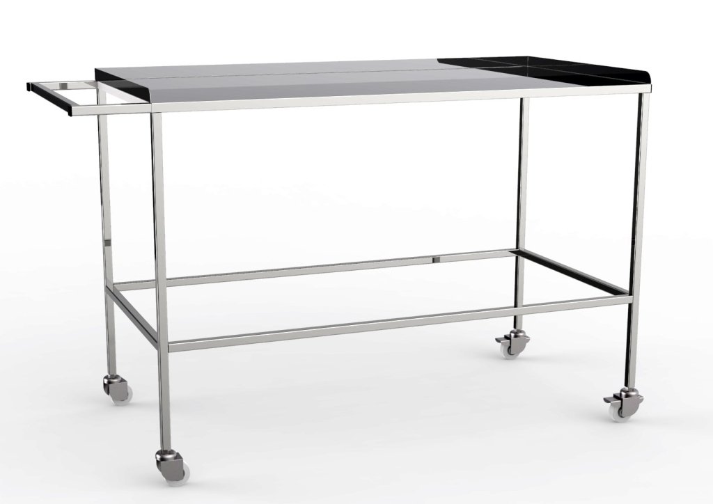 Stolik chirurgiczny wykonany jest z blachy o grubości 0,8 mm. Wysokość 880 mm, szerokość 1400 mm, głębokość 600 mm. Obszerny blat pozwala na przechowywanie dużej ilości urządzeń i narzędzi. Wygodną obsługę zapewniają 4 obrotowe koła, w tym 2 z hamulcem.