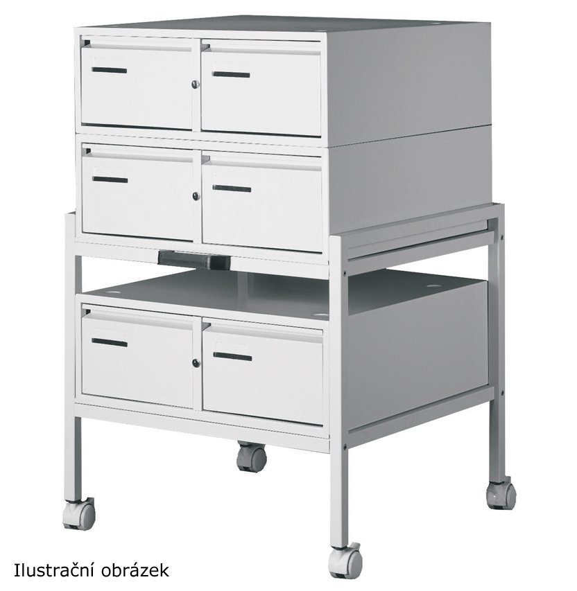 Stolik pod szafkę kartotekową, dwuszufladową A5 typ G45009, szerokość 626, wysokość 600, głębokość 590 mm. Prezentowane szafki na dokumenty nie są wliczone w cenę stołu. Kolor stolika jasnoszary RAL 7035, inne kolory za dopłatą i na zamówienie.