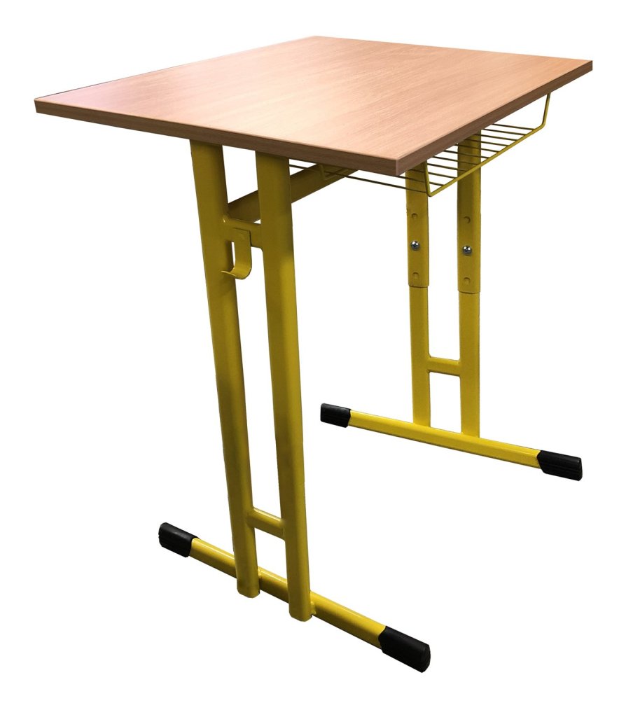 Stolik szkolny z regulacją wysokości, jednomiejscowy. Blat LTD 18mm z krawędzią ABS 2mm, proste narożniki. Rozmiar blatu 700 x 500 mm. Konstrukcja stalowa z płaskich profili owalnych. Kolor konstrukcji według próbki RAL.