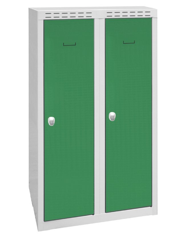 Szafa dwudrzwiowa, spawana, z drzwiami z podwójną powłoką dla większego bezpieczeństwa, wysokość 1200 x szerokość 800 x głębokość 500 mm. Zamykanie na zamek bębenkowy lub kłódkę, wyposażenie wnętrza - półki, drążek na wieszaki i haczyk + przegroda pionowa do oddzielania odzieży czystej i brudnej. Na zamówienie z nogami spawanymi - wysokość szafki z nogami 1350 mm. Kolor korpusu RAL 7035 jasnoszary.