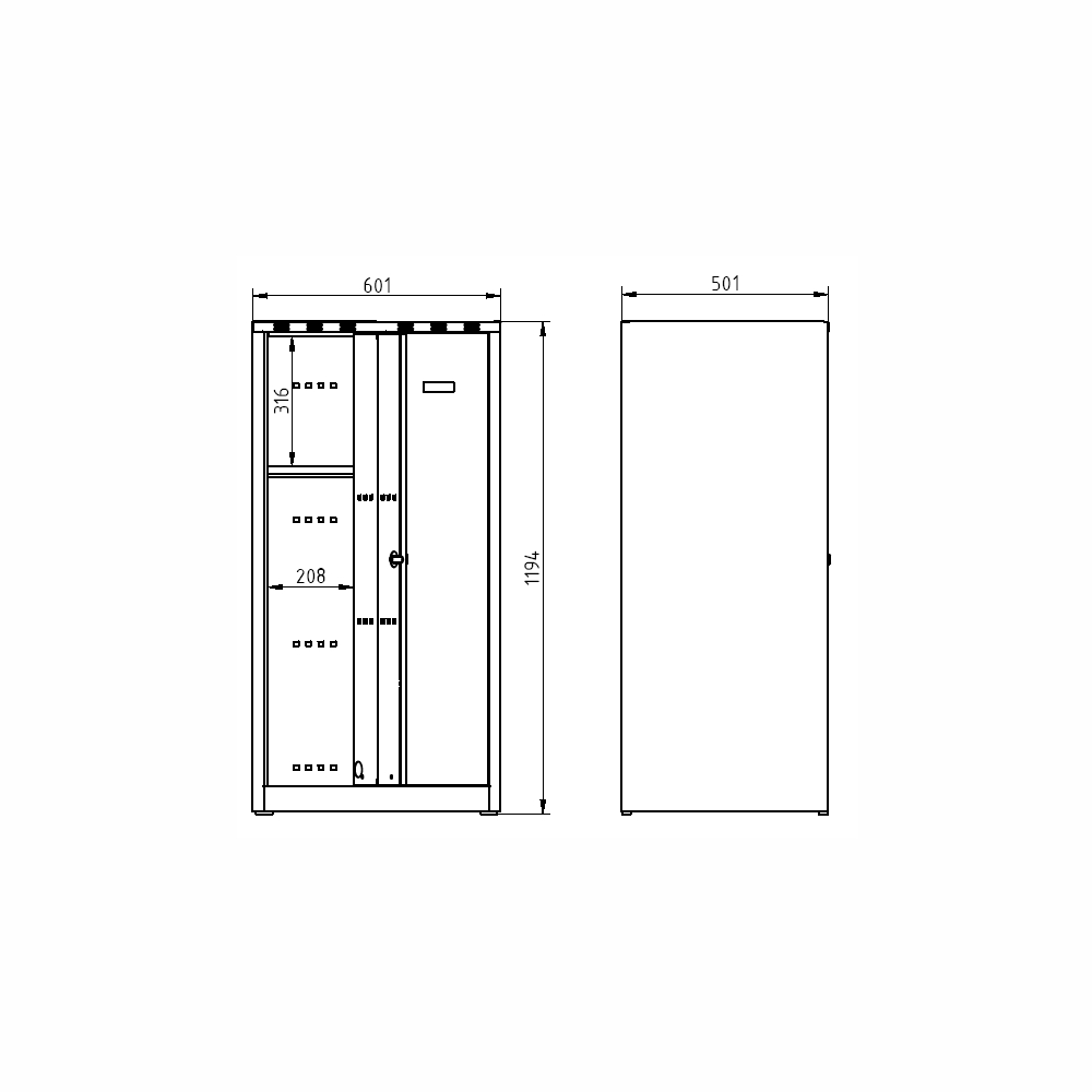 Szafka spawana z drzwiami dwuwarstwowymi dla większego bezpieczeństwa, wysokość 1200 x szerokość 300 x głębokość 500 mm. Zamykanie na zamek bębenkowy lub kłódkę, wyposażenie wnętrza: półka, drążek i haczyk. Na zamówienie z nogami spawanymi - wysokość szafki z nogami 1350 mm. Kolor korpusu RAL 7035 jasnoszary.