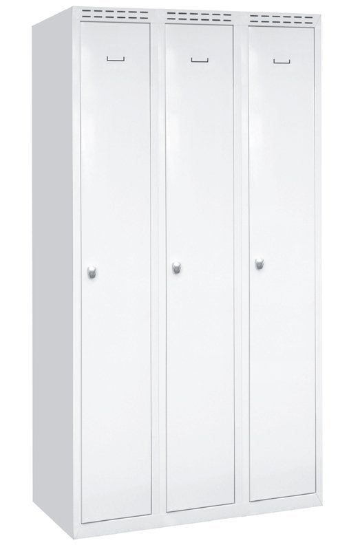 Szafa trzydrzwiowa, spawana, z drzwiami dwuwarstwowymi dla większego bezpieczeństwa, wysokość 1800 x szerokość 1200 x głębokość 500 mm. Zamykanie na zamek bębenkowy lub kłódkę, wyposażenie wnętrza - półki, drążek na wieszaki i haczyk + przegroda pionowa do oddzielania odzieży czystej i brudnej. Na zamówienie z nogami spawanymi - wysokość szafy z nogami 1950 mm. Kolor korpusu RAL 7035 jasnoszary.