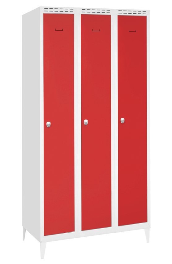 Szafa trzydrzwiowa, spawana, z drzwiami dwuwarstwowymi dla większego bezpieczeństwa, wysokość 1500 x szerokość 900 x głębokość 500 mm. Zamykanie na zamek bębenkowy lub kłódkę, wyposażenie wnętrza każdej przegródki - półki, drążek na wieszaki i haczyk. Na zamówienie z nogami spawanymi - wysokość szafy z nogami 1650 mm. Kolor korpusu RAL 7035 jasnoszary.