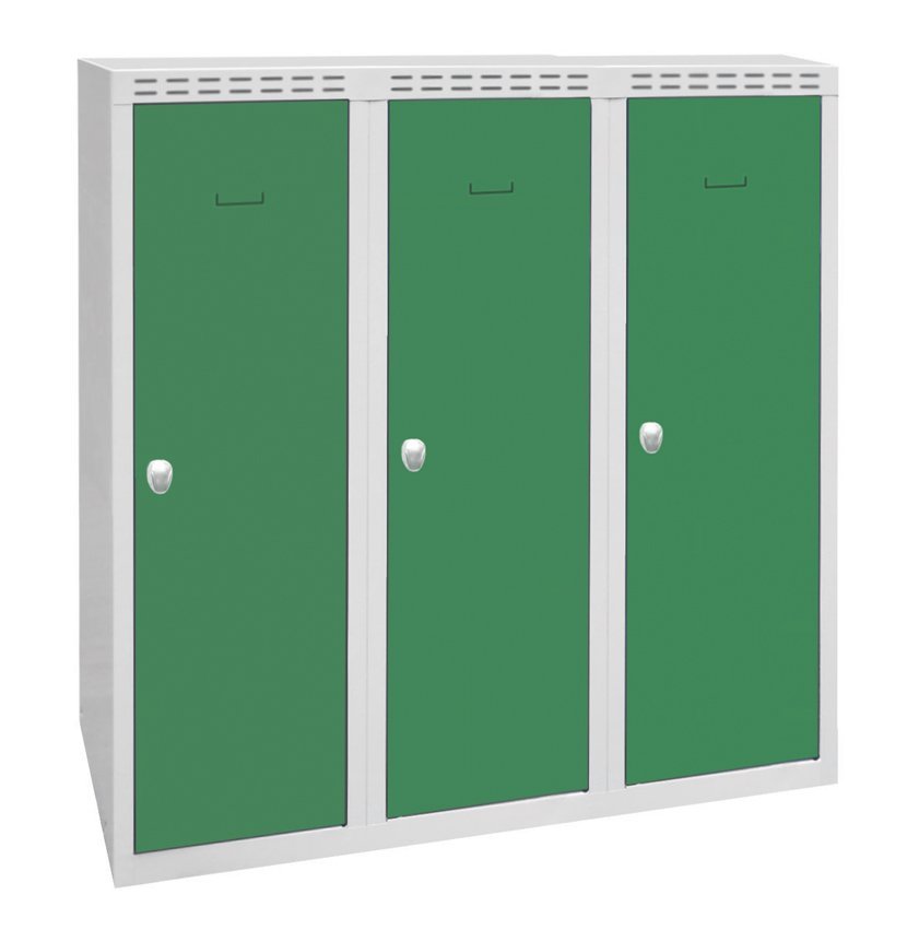 Szafa trzydrzwiowa, spawana, z drzwiami dwuwarstwowymi dla większego bezpieczeństwa, wysokość 1500 x szerokość 900 x głębokość 500 mm. Zamykanie na zamek bębenkowy lub kłódkę, wyposażenie wnętrza każdej przegródki - półki, drążek na wieszaki i haczyk. Na zamówienie z nogami spawanymi - wysokość szafy z nogami 1650 mm. Kolor korpusu RAL 7035 jasnoszary.