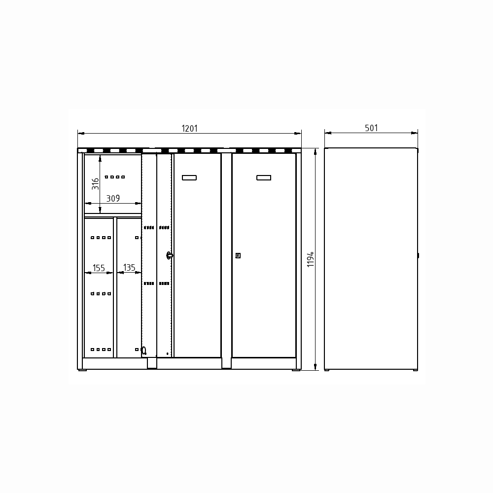 Szafa trzydrzwiowa, spawana, z drzwiami dwuwarstwowymi dla większego bezpieczeństwa, wysokość 1200 x szerokość 900 x głębokość 500 mm. Zamykanie na zamek bębenkowy lub kłódkę, wyposażenie wnętrza każdej przegródki - półki, drążek na wieszaki i haczyk. Na zamówienie z nogami spawanymi - wysokość szafki z nogami 1350 mm. Kolor korpusu RAL 7035 jasnoszary.