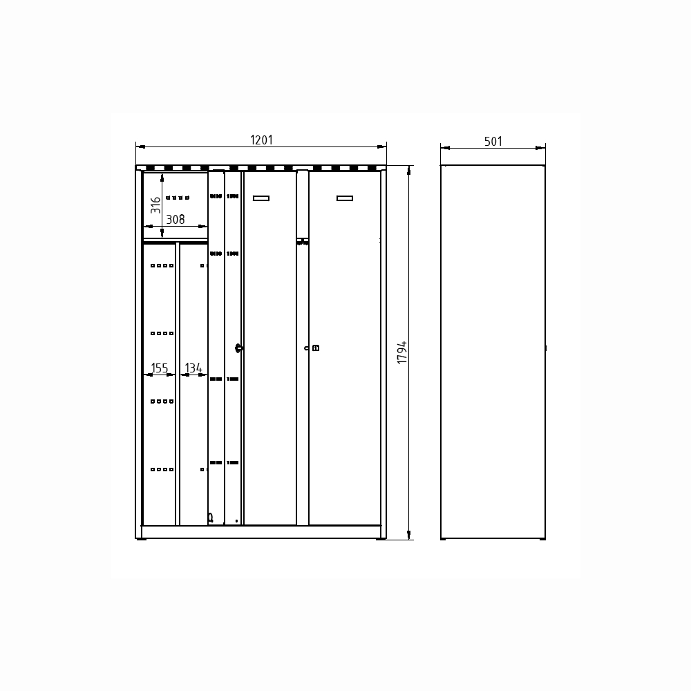 Szafa czterodrzwiowa, spawana, z podwójnymi drzwiami dla większego bezpieczeństwa, wysokość 1200 x szerokość 1200 x głębokość 500 mm. Zamek bębenkowy lub na kłódkę, wyposażenie wnętrza każdej przegródki - półki, drążek na wieszaki i haczyk. Na zamówienie z nogami spawanymi - wysokość szafki z nogami 1350 mm. Kolor korpusu RAL 7035 jasnoszary.