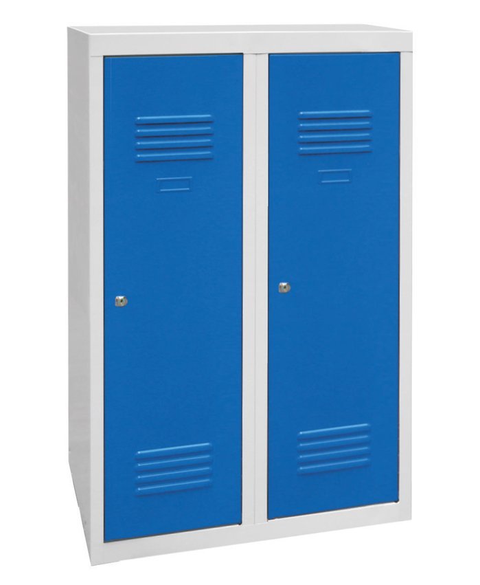 Szafa spawana dwudrzwiowa o wys. 1200 x szer. 800 x gł. 500 mm. Zamykanie na zamek bębenkowy lub kłódkę, wyposażenie wnętrza - półki, drążek na wieszaki i haczyk + przegroda do oddzielania odzieży czystej i brudnej. Na zamówienie z nogami spawanymi - wysokość szafki z nogami 1350 mm. Kolor korpusu RAL 7035 jasnoszary.