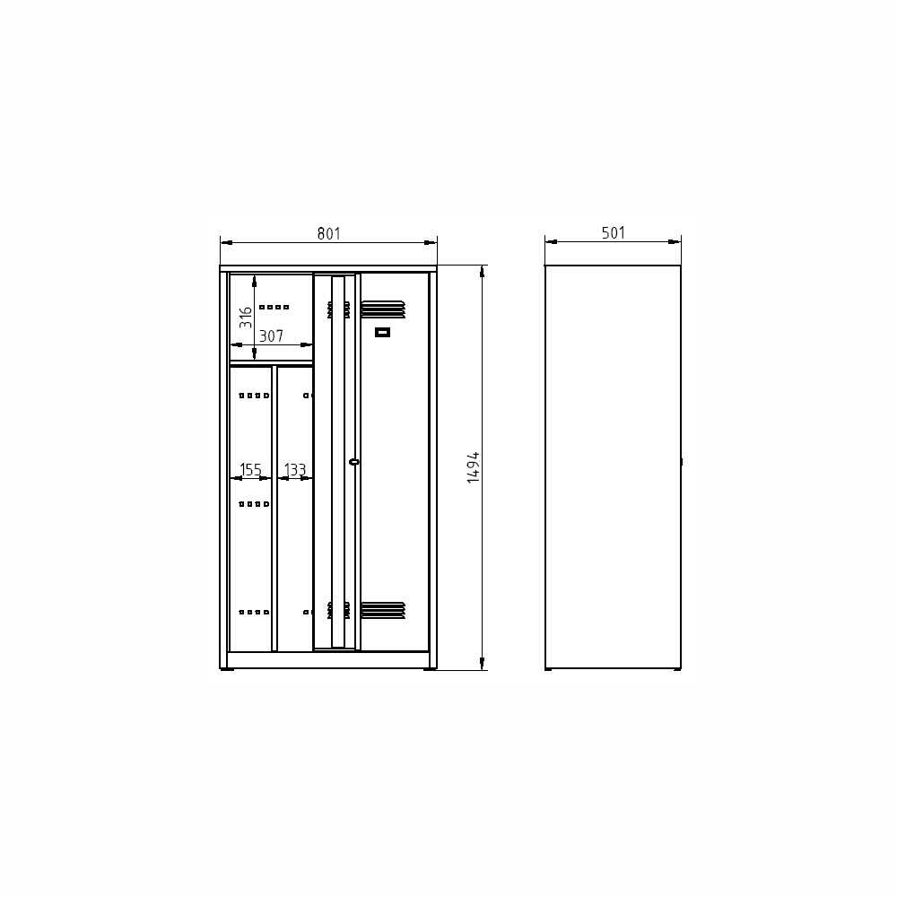 Szafa spawana dwudrzwiowa o wys. 1500 x szer. 800 x gł. 500 mm. Zamykanie na zamek bębenkowy lub kłódkę, wyposażenie wnętrza - półki, drążek na wieszaki i hak + przegroda do oddzielania odzieży czystej i brudnej. Na zamówienie z nogami spawanymi - wysokość szafy z nogami 1650 mm. Kolor korpusu RAL 7035 jasnoszary.