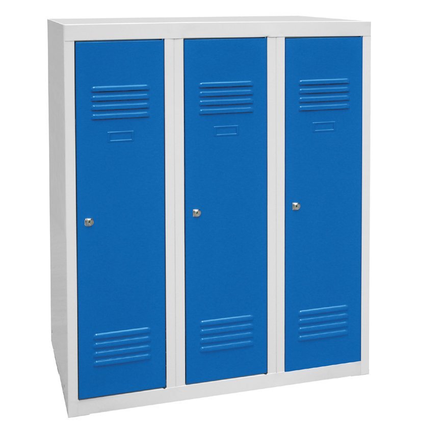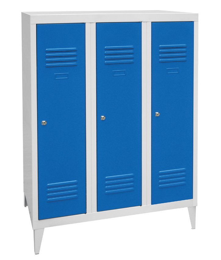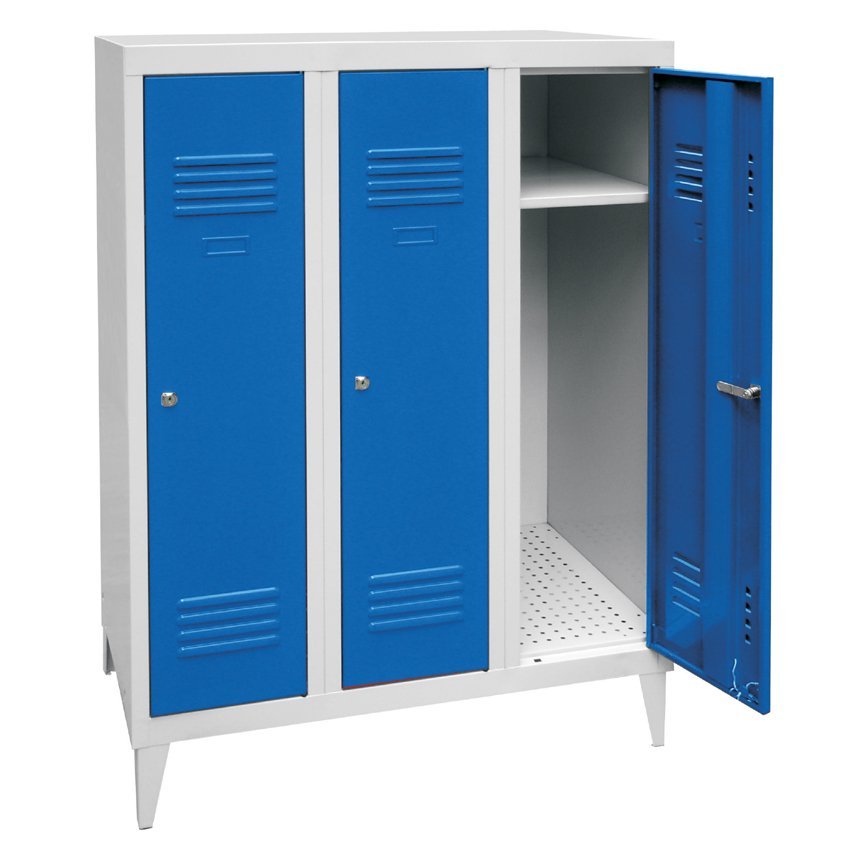 Szafa spawana, trzydrzwiowa, wys. 1200 x szer. 1200 x gł. 500 mm. Zamek bębenkowy lub na kłódkę, wyposażenie wnętrza - półki, drążek na wieszaki i haczyk + przegroda pionowa do oddzielania odzieży czystej i brudnej. Na zamówienie z nogami spawanymi - wysokość szafki z nogami 1350 mm. Kolor korpusu RAL 7035 jasnoszary.