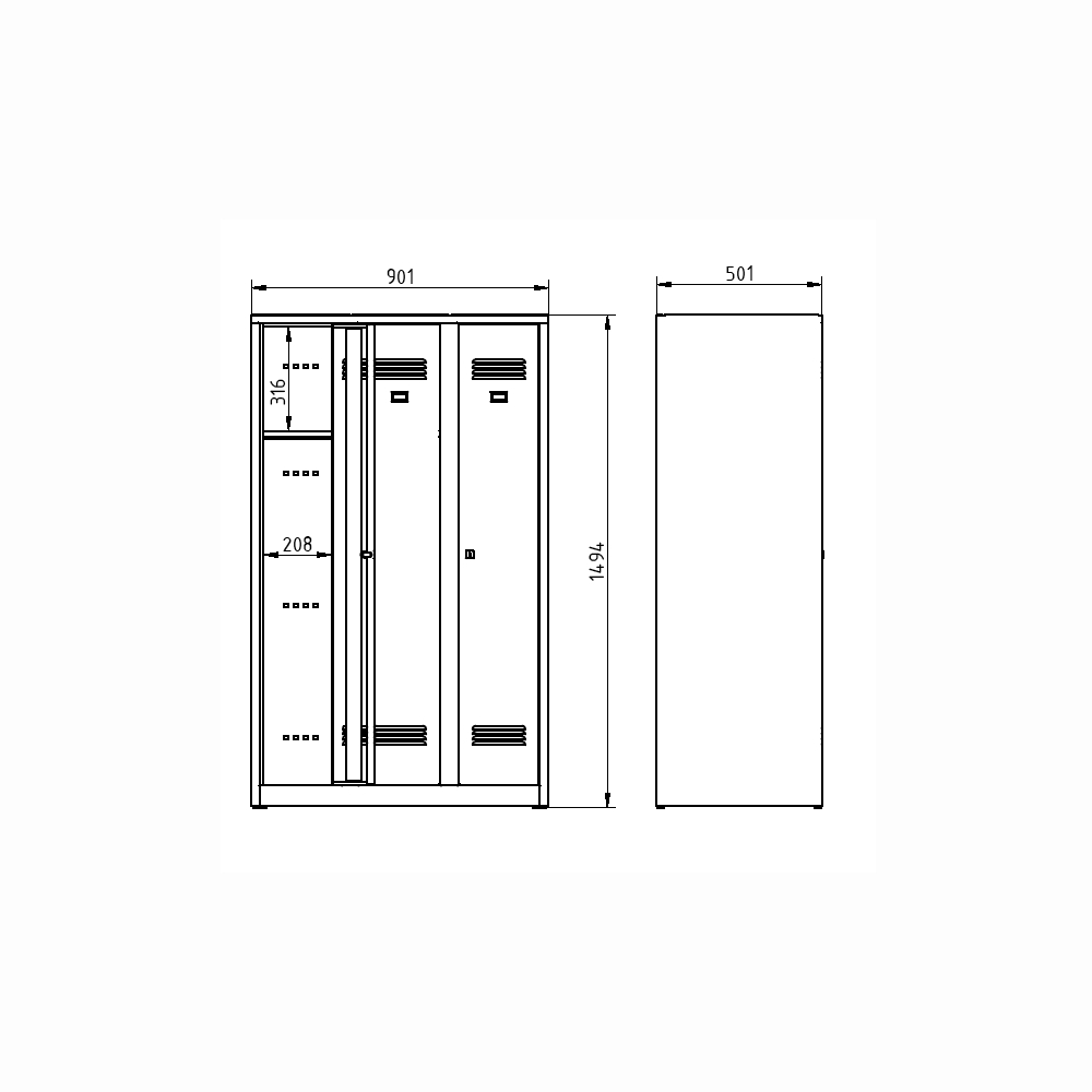 Szafa spawana, trzydrzwiowa, o wys. 1500 x szer. 900 x gł. 500 mm. Zamek bębenkowy lub kłódka, wyposażenie wnętrza każdej przegródki - półki, drążek na wieszaki i haczyk. Na zamówienie z nogami spawanymi - wysokość szafy z nogami 1650 mm. Kolor korpusu RAL 7035 jasnoszary.