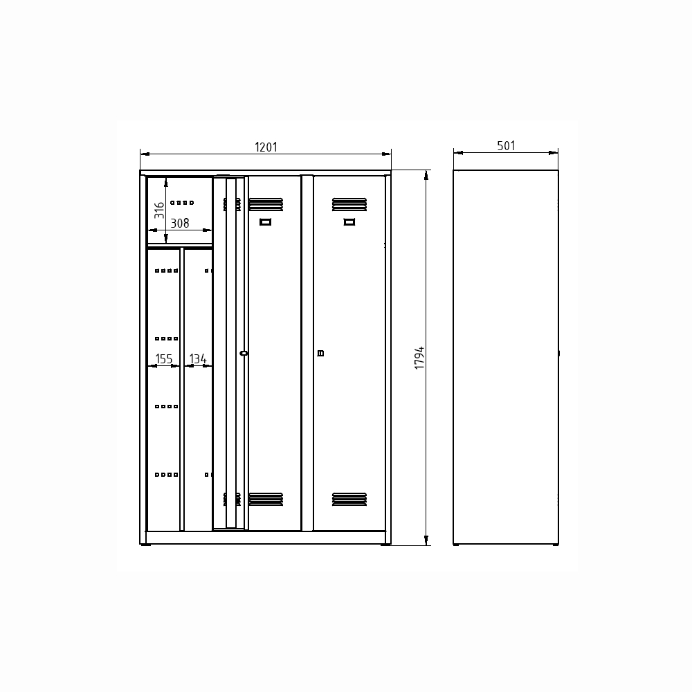 Szafa spawana, trzydrzwiowa, wys. 1200 x szer. 1200 x gł. 500 mm. Zamek bębenkowy lub na kłódkę, wyposażenie wnętrza - półki, drążek na wieszaki i haczyk + przegroda pionowa do oddzielania odzieży czystej i brudnej. Na zamówienie z nogami spawanymi - wysokość szafki z nogami 1350 mm. Kolor korpusu RAL 7035 jasnoszary.