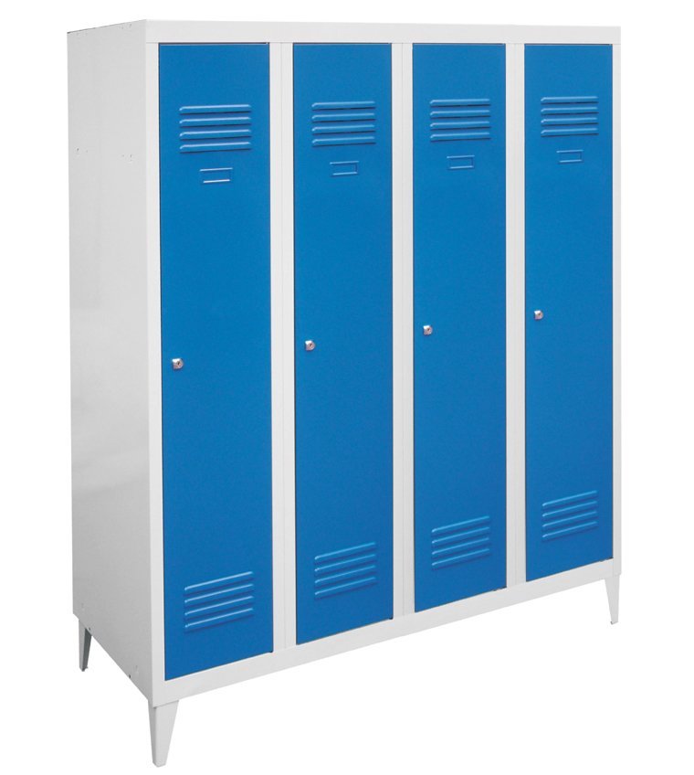Szafa spawana czterodrzwiowa o wys. 1500 x szer. 1200 x gł. 500 mm. Zamek bębenkowy lub na kłódkę, wyposażenie wnętrza każdej przegródki - półki, drążek na wieszaki i haczyk. Na zamówienie z nogami spawanymi - wysokość szafy z nogami 1650 mm. Kolor korpusu RAL 7035 jasnoszary.