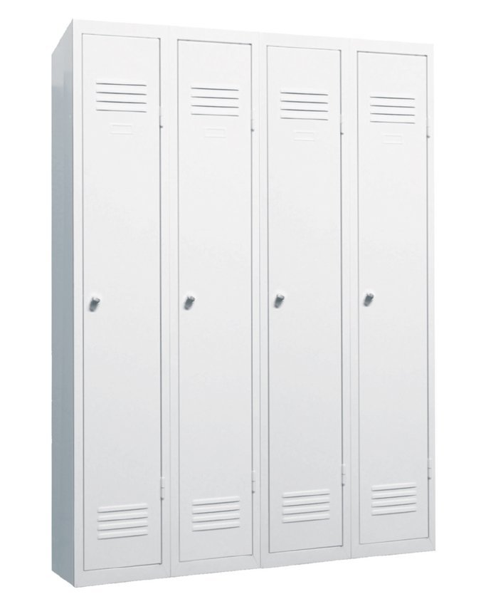 Szafa spawana czterodrzwiowa o wys. 1500 x szer. 1200 x gł. 500 mm. Zamek bębenkowy lub na kłódkę, wyposażenie wnętrza każdej przegródki - półki, drążek na wieszaki i haczyk. Na zamówienie z nogami spawanymi - wysokość szafy z nogami 1650 mm. Kolor korpusu RAL 7035 jasnoszary.