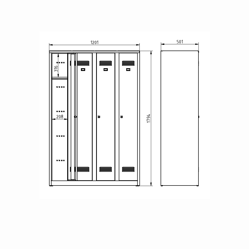 Szafa spawana, trzydrzwiowa, wys. 1200 x szer. 1200 x gł. 500 mm. Zamek bębenkowy lub na kłódkę, wyposażenie wnętrza - półki, drążek na wieszaki i haczyk + przegroda pionowa do oddzielania odzieży czystej i brudnej. Na zamówienie z nogami spawanymi - wysokość szafki z nogami 1350 mm. Kolor korpusu RAL 7035 jasnoszary.