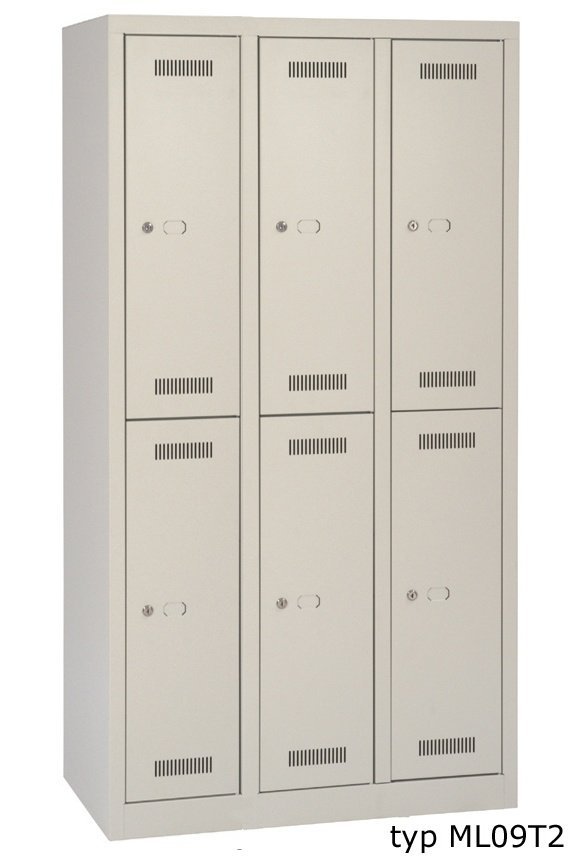 Szafka spawana z drzwiami dzielonymi, 6 schowków. Model na cokole lub na nogach. Szerokość schowka 300 mm, wysokość 1700 mm, z cokołem 1806 mm, z nogami 1850 mm, z podstawą ławki 2100 mm. Ławka standardowo wyposażona jest w nóżki rektyfikacyjne. Zamek cylindryczny, za dopłatą - na kłódkę lub zamek szyfrowy obrotowy. Kolor korpusu jasnoszary (RAL 7035), kolor drzwi do wyboru.