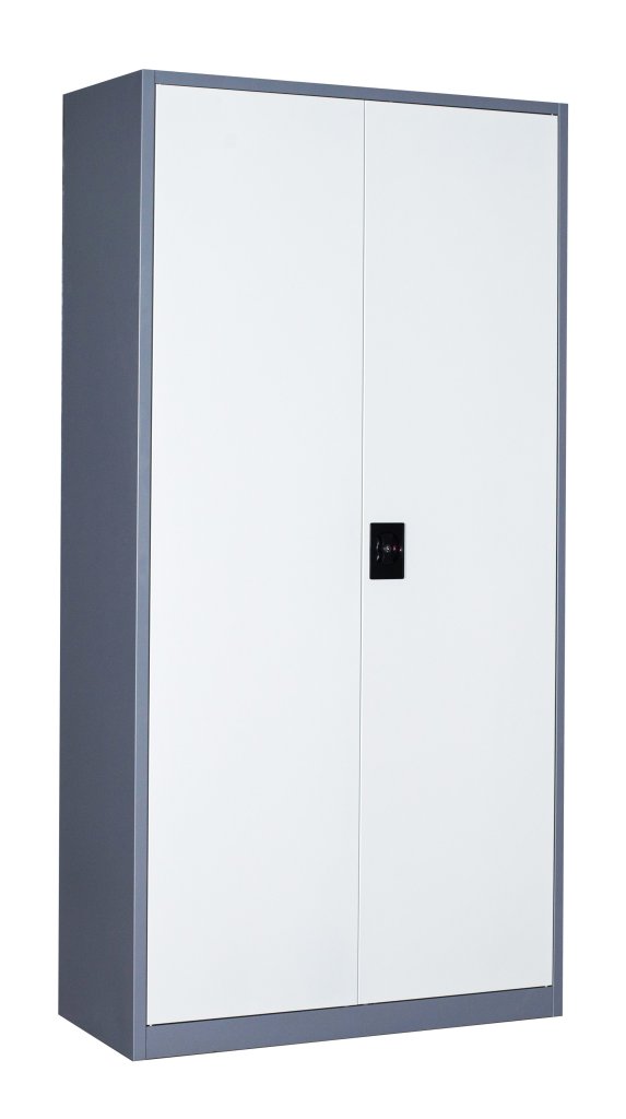 Dwudrzwiowa szafa biurowa metalowa demontowana wykonana z blachy stalowej o grubości 0,6 mm. Wysokość 1850 x szerokość 900 x głębokość 390 mm, 4 x półki, zamek bębenkowy z kółkiem i dwoma kluczami. Obróbka powierzchni szarą farbą proszkową RAL 7047.
