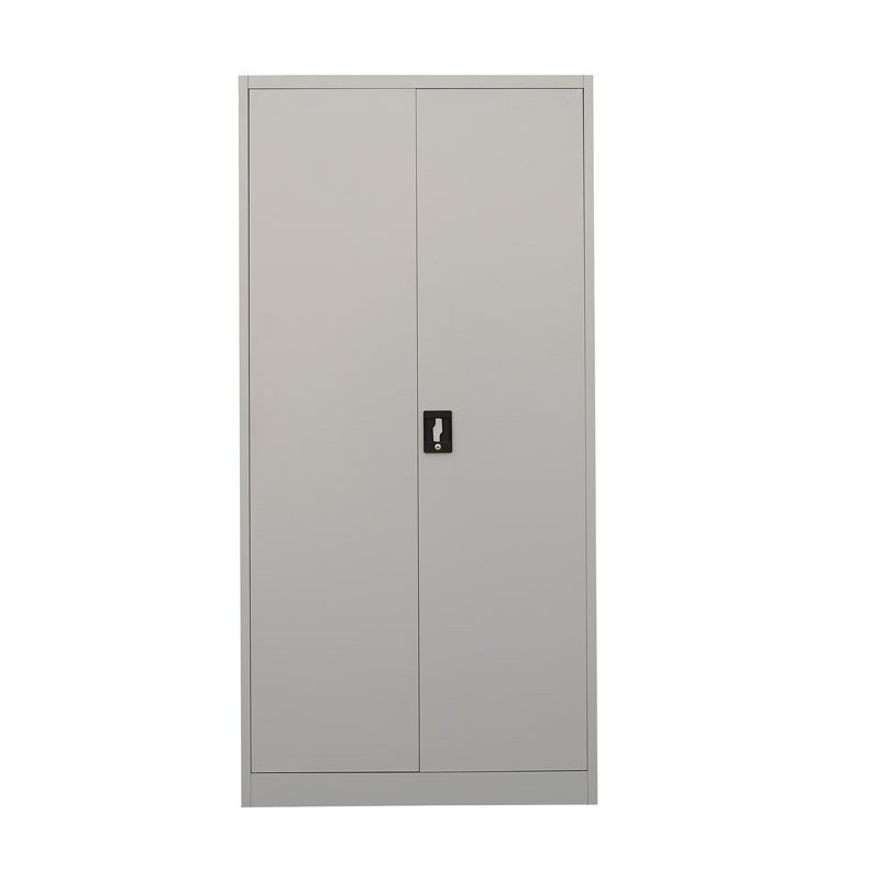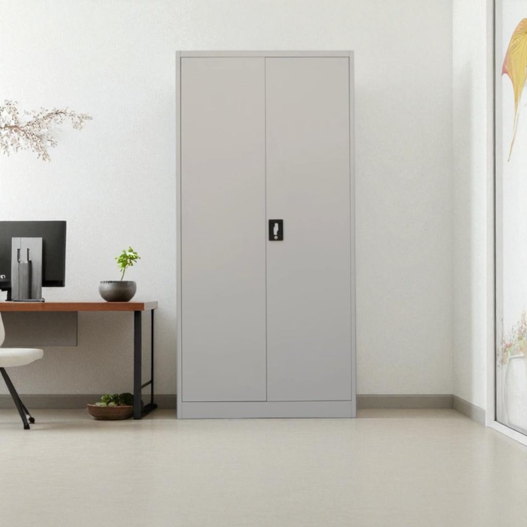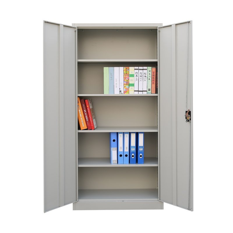 Dwudrzwiowa szafa biurowa metalowa demontowana wykonana z blachy stalowej o grubości 0,6 mm. Wysokość 1850 x szerokość 900 x głębokość 390 mm, 4 x półki, zamek bębenkowy z kółkiem i dwoma kluczami. Obróbka powierzchni szarą farbą proszkową RAL 7047.