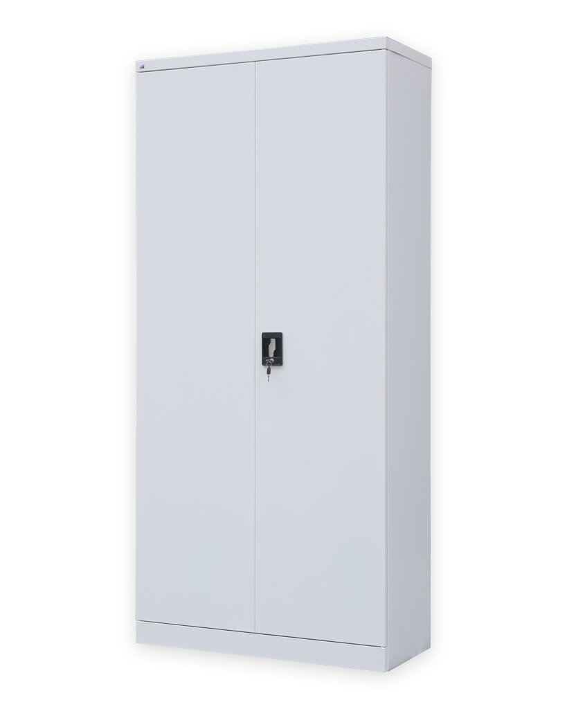 Dwudrzwiowa szafa biurowa metalowa demontowana wykonana z blachy stalowej o grubości 0,6 mm. Wysokość 1850 x szerokość 900 x głębokość 390 mm, 4 x półki, zamek bębenkowy z kółkiem i dwoma kluczami. Obróbka powierzchni szarą farbą proszkową RAL 7047.