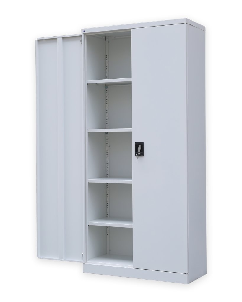 Szafa biurowa metalowa dwudrzwiowa do samodzielnego montażu wykonana z blachy stalowej o grubości 0,6 mm. Wysokość 1950 x szerokość 900 x głębokość 400 mm, 4 x półki, zamek bębenkowy z dwoma kluczami. Obróbka powierzchni farbą proszkową.